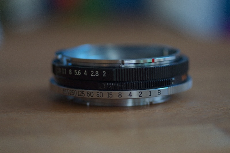 An der Kamera lässt sich der Aufbau mit dem Bajonett, der Blendensteuerung und der Belichtungssteuerung leicht lösen. Unter der Belederung sind vier Schrauben, die man löst. Danach kann man die Platte mit dem Aufbau abnehmen. Mit dem Dremel und einer Trennscheibe habe ich den Aufbau soweit gekürzt, dass sich das Objektiv mit Bajonett und Adapter auf Unendlich fokussieren ließ. Den Ring mit der Belichtungssteuerung habe ich aufgeklebt und darauf dann das Konica-Bajonett. Der Ring mit dem Moosgummi dient als Lichtdichtung. Abschließend habe ich noch das Bajonett geschwärzt. Fertig.
