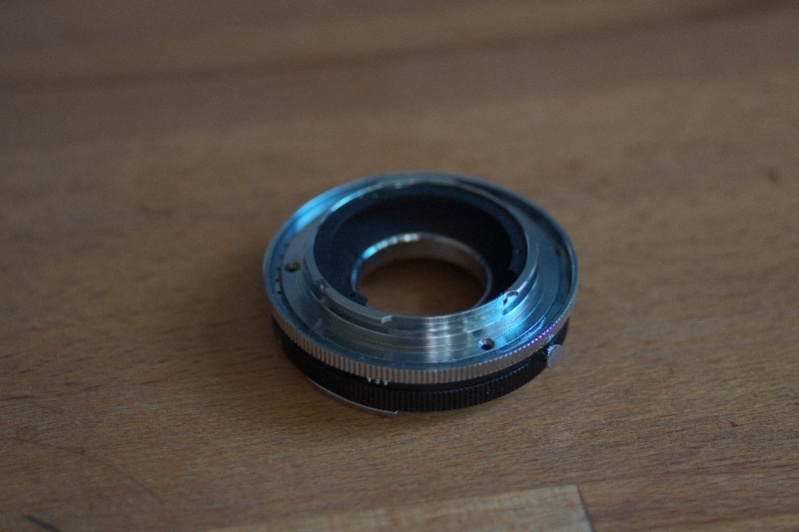 Bei einer ersten Version des Adapters hatte ich dies nicht bedacht. Der Adapter war schon fertig, das 2,0/50mm Objektiv neu auf Unendlich eingestellt - und dann ist bei einer Nahaufnahme beim Fokussieren der Blendenzapfen nach vorne hin (zum Objektiv) aus der Führung gerutscht. Das Objektiv ließ sich danach nur noch mit Gewalt vom Adapter lösen. Das Resultat war ein ein verbogener Blendenzapfen im Objektiv und ein verbogener Zapfen im Adapter. Ich habe mir dann noch mal alle vier Objektive angesehen und drei davon haben ähnliche Schäden. Meiner Meinung nach ist dies ein konstruktiver Mangel. Naja.