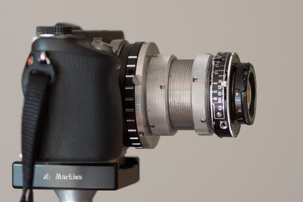über eine M25 Wandlerplatte, 9 mm Mutter, 25 mm Tubus und 12 mm Mutter.