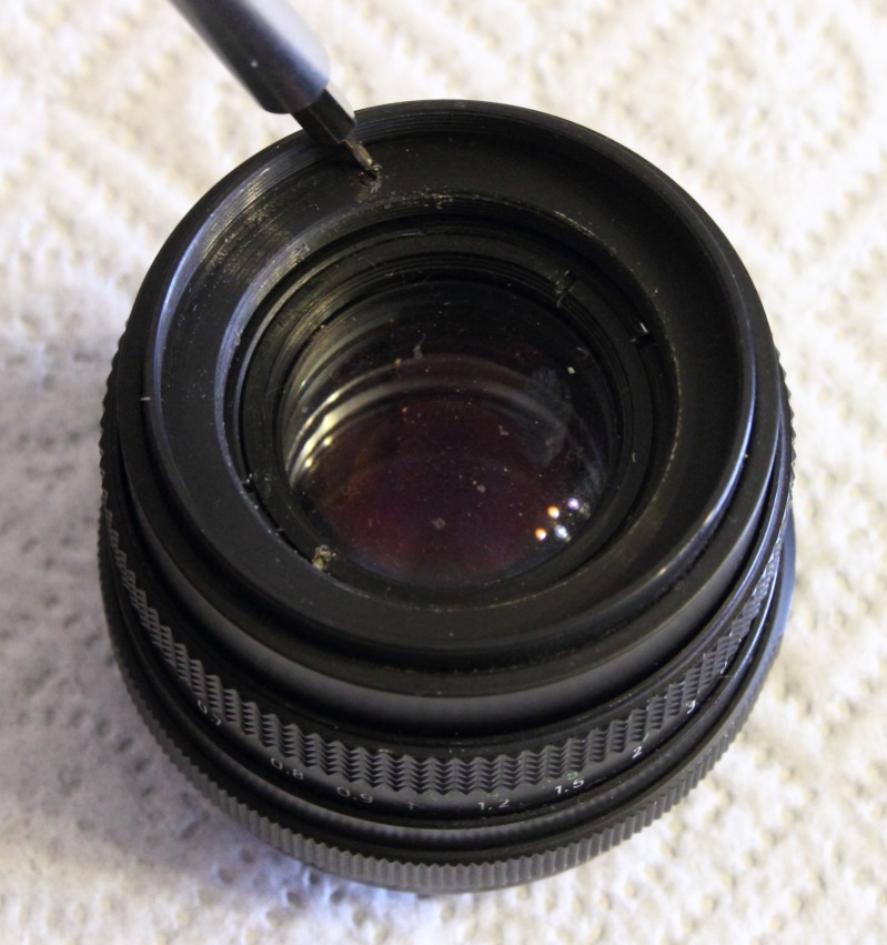 Darunter befindet sich das vordere Linsenpaket, welches mit einem Messschieber oder anderen geeigneten Werkzeug ausgeschraubt werden kann.