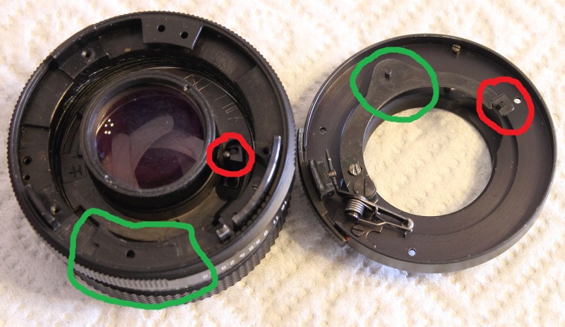 Der im Deckel grün eingekreiste Zapfen gleitet an der grün eingekreisten Kurvenscheibe des Blendenrings entlang.