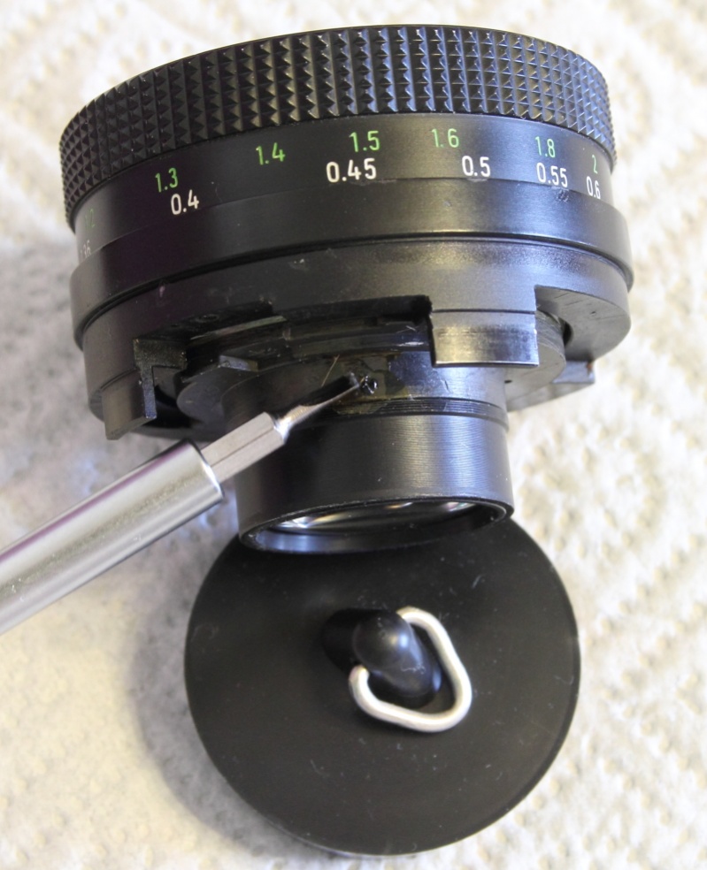 Dabei auf die 2 Kugeln achten, die sich unter dem A/M Umschalter und seitlich unter dem Blendenring befinden!