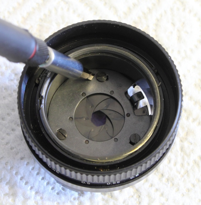 Nun wieder zur Vorderseite des Objektivs. Nach Entfernen der 3 Schrauben, auf welche der Schraubenzieher zeigt kann das ganze Blendenelement entnommen werden.