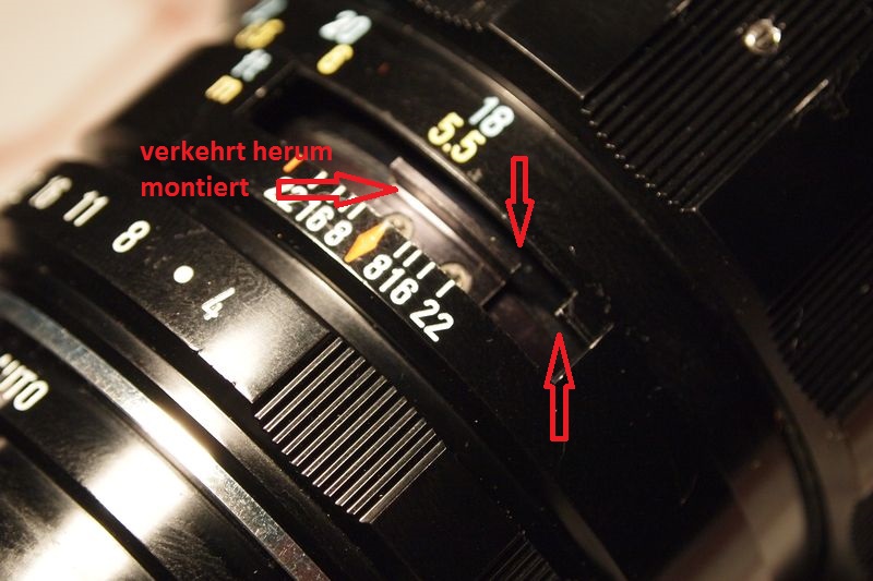 Die Begrenzung des Anschlags des Fokusrings ( oo bis 5,5m ) erfolgt allein durch den kleinen Winkel im Bild,