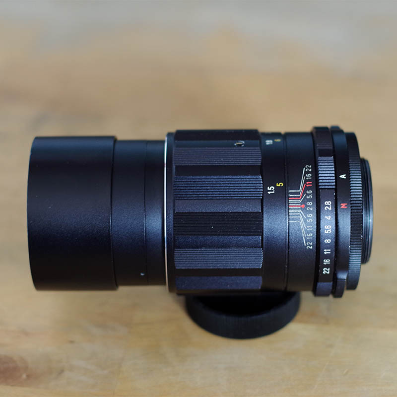 Alter Thread, aber für mich neues Objektiv. Googelt man das Ding kommt man eigentlich immer nur zu der oben vorgestellten schweren Metallfassung. Meines sieht aber vollkommen anders aus und kommt auch nicht mit einem M42 Gewinde sondern mit Konica-Bajonett. Von den Bildern her bei allphotolenses könnte es auch eine um- oder falsch gelabelte RMC Version sein. Allerdings passt die minimale Blende von 16 nicht dazu.