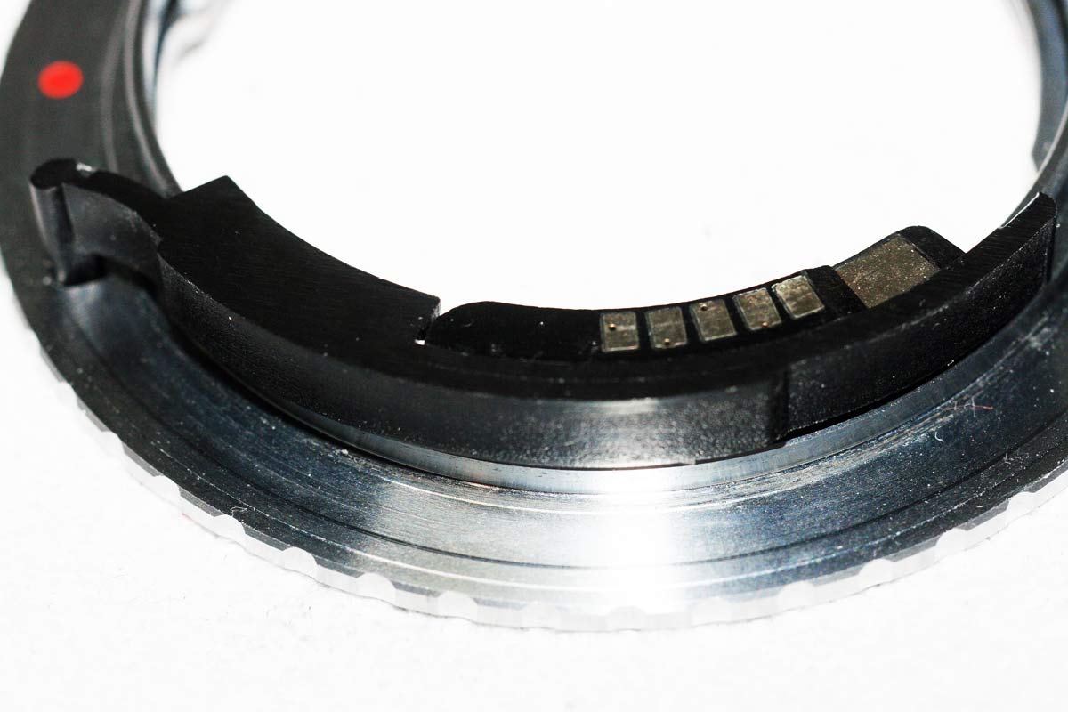 Darüber hinaus löst sich so ein Chip dann bereits beim Eindrehen des Adapters, so das die Wahrscheinlichkeit, das - selbst wenn sich ein Chip in der Kamera vom Objektiv unbemerkt lösen würde, dieser nicht "vagabundiert" sondern an der Stelle durch die Druck ausübenden Kontakte eingeklemmt wird und da auch nicht weg kann.
