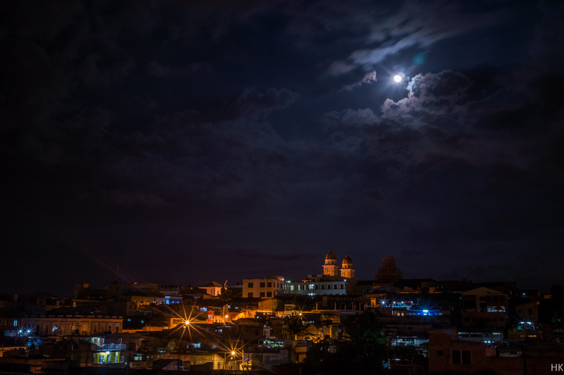 Sehr schön sind die ausgeprägten Sterne, die das Voigtländer mit seinen 10 Blendenlamellen abgeblendet an punktförmigen Lichtquellen erzeugt. Leider sind aber manchmal auch Flares auf der jeweils von der Bildmitte abgewandten Seite heller Lichter dabei. Da diese, wenn sie überhaupt auftreten, meistens sehr klein und scharf umrissen sind, kann man sie zum Gück häufig einfach wegstempeln. Hier habe ich sie unverändert belassen: