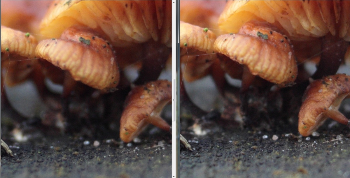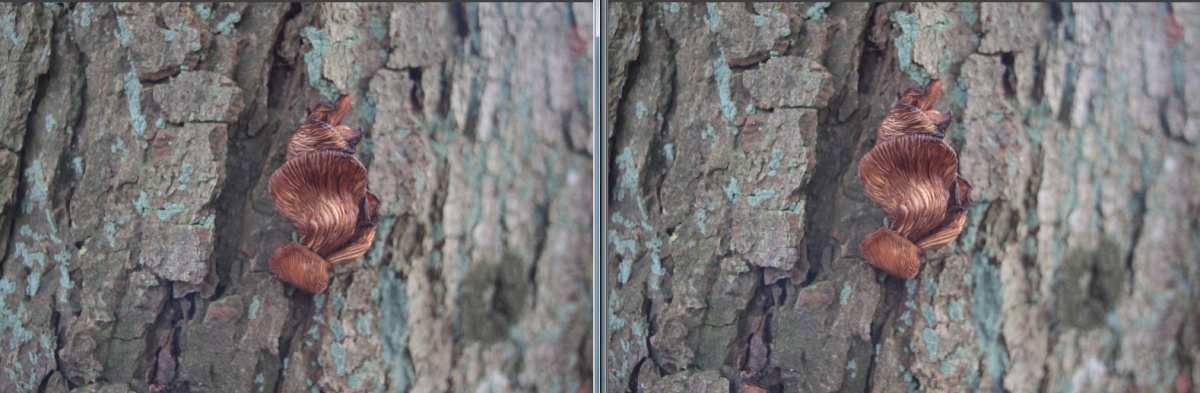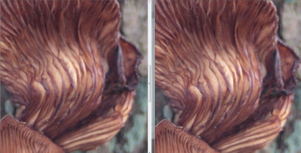 und hier 100% Crops aus dem Zentrum, das Tokina oben f2.8 / 5.6 /8.0, das Exakta unten. Wie an den Schatten zu sehen, war das Licht nicht konstant