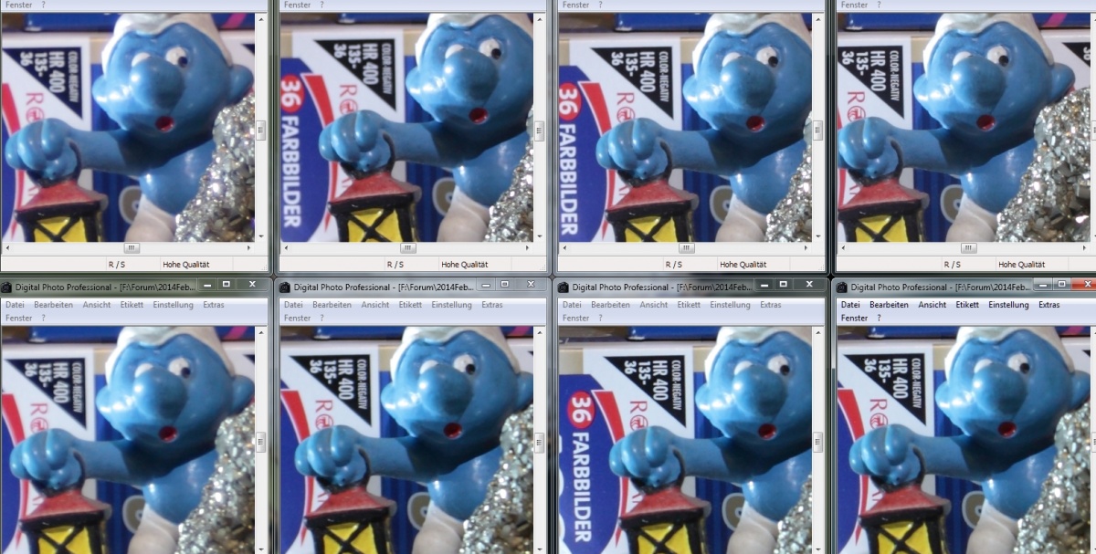 Alle Bilder sind unbearbeitete Screenshots aus dem DPP und bis auf die Wand-Fotos gibt es keine direkten Vergleiche, sondern nur Eindrücke geschossen mit einer Canon 50d, alles freihand, ISO 400, per Liveview fokussiert.