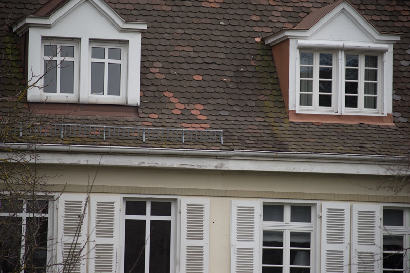 Bei offener Blende gibt es Farbsäume an den Kontrastkanten (z.B. oberhalb der Regenrinne, oder rechts am Rand des weißen Dacherkers). Mit Abblenden verschwinden sie in der Bildmitte, sind aber auch bei Blende 8 noch an den Bildrändern vorhanden.