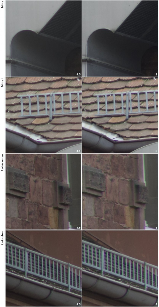 Schon bei offener Blende sehr viele Details in Bildmitte, aber auch am Rand. Der Mikrokontrast wird mit Abblenden besser.