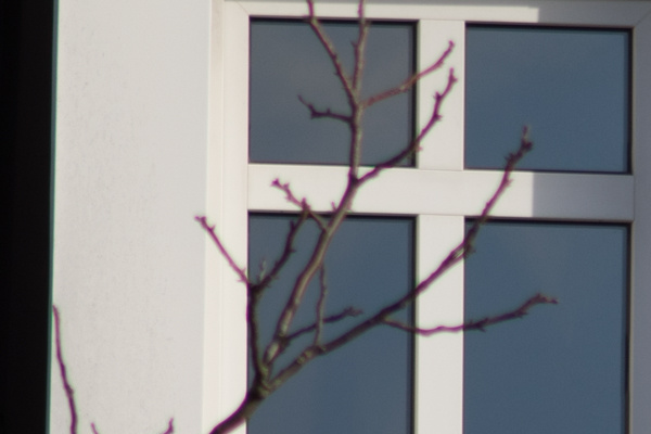 Bei starken Kontrasten ausgeprägte Farblängsfehler bei offen Blende. Querfehler in der Bildmitte nur sehr schwach, werden zum Rand hin aber stärker (siehe auch Bilder oben)