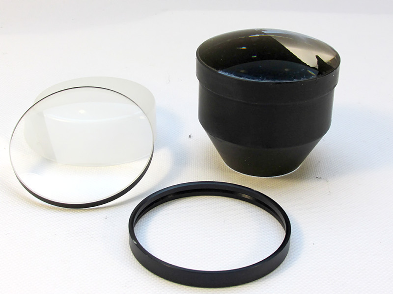 Links sieht man die Frontlinse, in der Mitte den Distanzring und rechts der große Block mit der Luft dazwischen.
