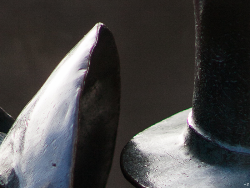 Man sieht hier schwach ausgeprägte Längs-CA (Magenta vor der Schärfeebene, Grün hinter der Schärfeebene), aber keine Überstrahlungen.