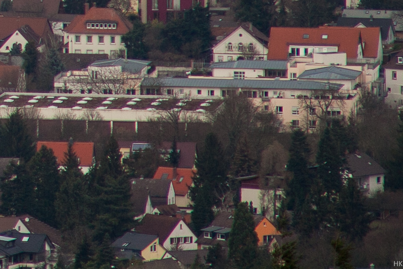 Das Nikkor 4/200 zeichnet sich nach meinem Eindruck aus durch hohe Kontraste und eine gute Schärfe schon bei Offenblende. Erkauft wird das durch eine gewisse Tendenz zu CAs, die sich zwar ausgesprochen gut korrigieren lassen, aber hier habe ich sie natürlich so belassen wie sie auf den Sensor kommen. Insgesamt würde ich dem Objektiv eine saubere aber keine spektakuläre Leistung bescheinigen. Aber Maßstäbe ergeben sich aus dem Vergleich, also habe ich das Nikkor 4/200 zumindest auf große Entfernung mal direkt mit dem exzellenten AF-Nikkor 2.8/80-200 ED verglichen. Alle Bilder vom Stativ mit der EOS 5DII, Weißabgleich und Umwandlung in jpg mit identischen Einstellungen: