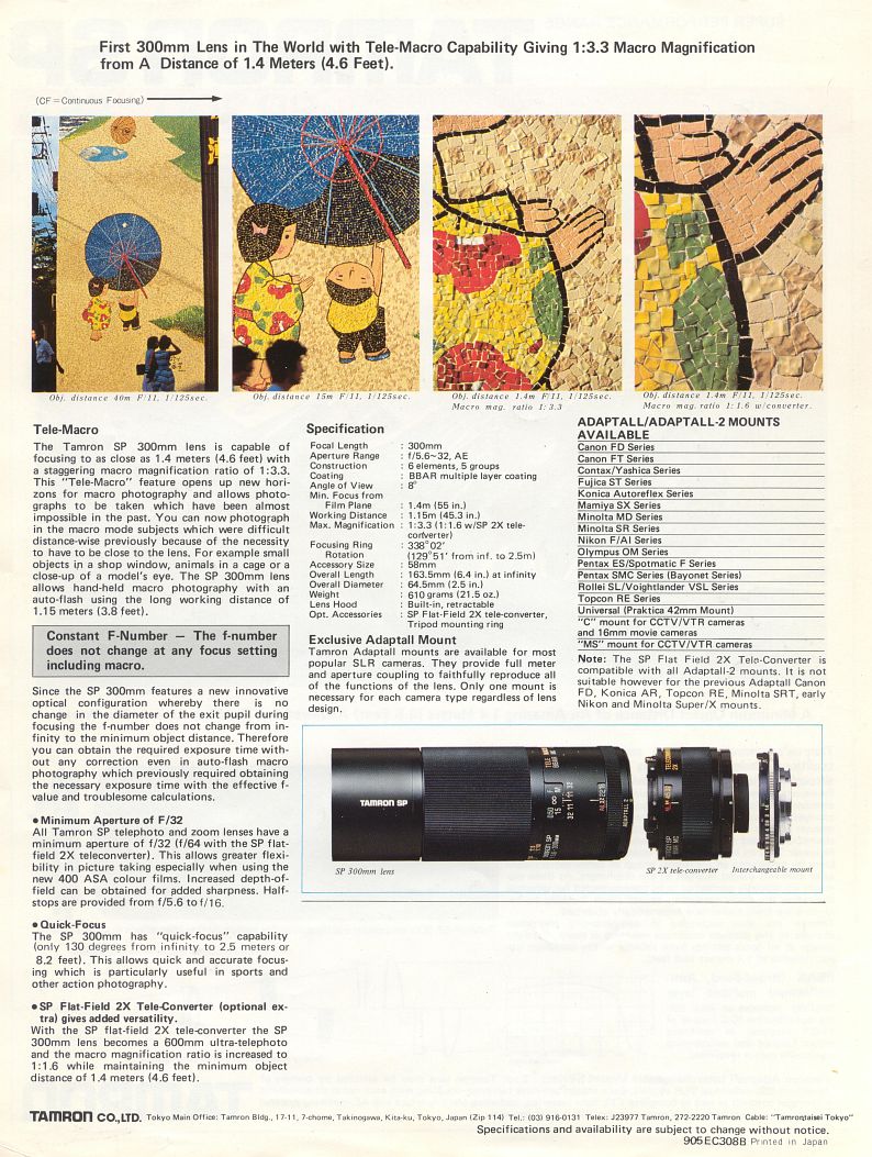 "A very good fixed focal length lens with excellent macro capabilities. Lens continuously focuses from infinity to 1:3.3 macro and features a built-in lens hood. Most importantly, this lens features a special "spherical aberration compensator group" (the light blue shaded elements in the above drawing) to remove the focus group's spherical aberration and field curvature when close focusing. A similar optical group is also found in several other SP telephoto lenses which Tamron produced during the 1980s. This lens is worth the price if you need a lens for macro work yet need considerable working distance from the subject for personal safety or other reasons. This lens should have sold better in its day, but few photographers understood or appreciated the benefit of the spherical aberration compensator group used within this lens for close focus work."