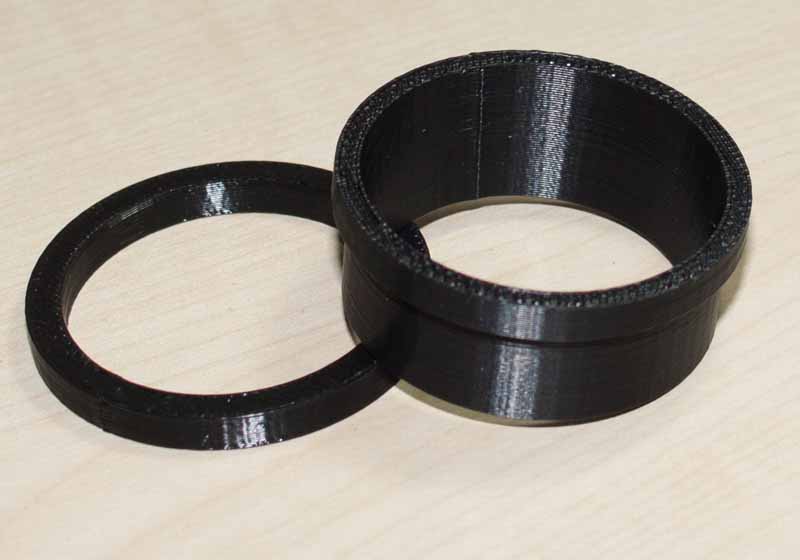 Ich hatte mit 3D-Druckern erzeugte Teile vorher noch nie in den Händen gehalten. Die Teile sind ausreichend stabil. Durch die Herstelltechnologie bedingt sind sie an der Oberfläche etwas gerillt. Das ist am Innendurchmesser sicher auch vorteilhaft. Leider glänzt die Oberfläche etwas. Durch feines Sandpapier ist das Material leicht zu bearbeiten. Ich lasse im Fall des 200er Objektivs die keglige Innenfläche zunächst unbearbeitet und beobachte erst einmal. Durch die Teile ist eine gute Dichtung möglich. Der verbleibende Spalt ist eigentlich nur durch die Präzision beim Abbohren des M42-Adapters abhängig. In den Bildern sind ein 35er und ein 200er Objektiv ohne und mit Lichtfalle, sowie die zwei Kunststoffteile selbst zu sehen. Die Kunsstoffteile werden einfach in das M42 Gewinde der Adapter geklemmt/geklebt.