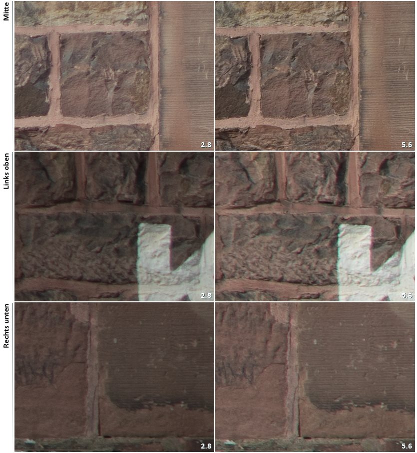 Wie schon auf dem ersten Mauerbild zu sehen, bei 2.8 leichte Vignettierung, bei 4 nur gering und ab 5.6 keine mehr.
