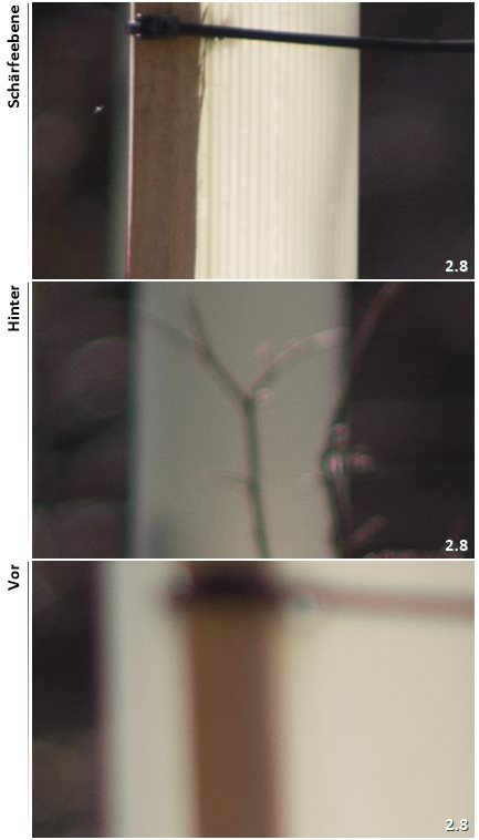 Drei Ausschnitte, einmal die Schärfeebene, dann dahinter und davor:
