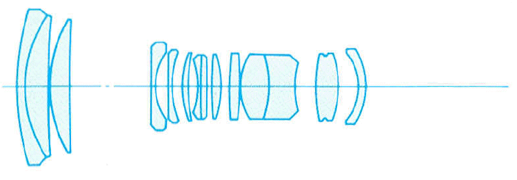 Der Linsenaufbau ist für die Zeit, es stammt aus 1975, außerordentlich komplex. 14 Elemente in 11 Gruppen wurden verbaut: