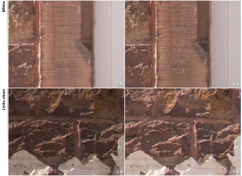 Zunächst der allgemeine Schärfe-Eindruck bei Blende 2.5 und 5.6 (Sony A7, ISO 100, Aufnahme mit Stativ)