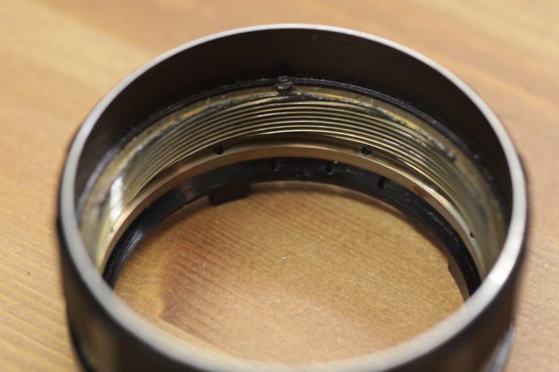 Größtes Problem ist dann aber der Zusammenbau. Das Helicoid kommt ja nun anders zum sitzen, es sind nicht mehr die ursprünglichen Gewindegegenstücke, sondern man baut ein paar Gewindegänge versetzt zum Original ein, d.h. setzt etwas anders an. Das ist ein ziemliches Geduldsspiel, bis man den richtigen Einstieg bekommt. Zudem habe ich bestimmt ein Duzend mal den Fokusring wieder abschrauben müssen, weil alles zu stramm wurde und den Getriebering wieder etwas herausdrehen müssen. Da spielt einiges zusammen, ich hatte auch den Eindruck, das bei zu weit eingedrehtem Fokusring der Helicoid schwergängig wurde. Ist viel "try and error". Zwischenzeitlich ist das Objektiv auch schon mal Nahe am Müll vorbeigegangen. :kotz: