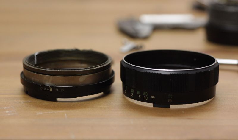 Hat aber eine Menge Schweiß gekostet, wie Henry schon prophezeit hat. Den Helicoid auszubauen war keine gute Idee. Dabei habe ich mir zusätzlich (sonst wär´s ja zu einfach) eine Macke in den weichen Messing gehauen, die ich dann mühevoll wieder glätten musste. Sicher hätte man auch von vorne öffnen können, um an die drei Schrauben für den Fokusring zu gelangen. Mangels Werkzeug hat das aber nicht hingehauen.