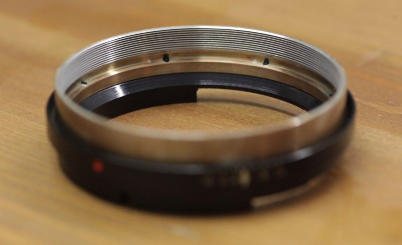 Darüber wird der Fokusring gestülpt und mit den drei kleinen Schrauben an der Kante des Rings befestigt. Löst man die drei Schrauben, kann man den Ring tiefer hineindrehen und gewinnt so einige 10tel Millimeter (Natürlich erst, nachdem man den Grind der letzten 20 Jahre da raus hat).