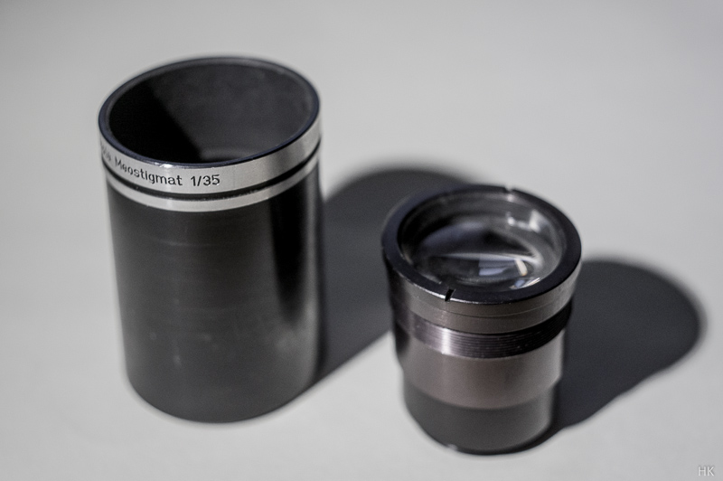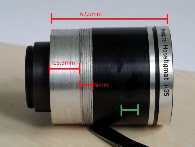 Für etwaige Umbauvorhaben ist es vielleicht interessant noch einmal explizit zu erwähnen, dass dieses Objektiv ebenso wie das Meostigmat 1.3/35 aus einer optischen Gruppe besteht, die als Ganzes in die Aluhülse mit 52.5mm Durchmesser eingeschraubt ist. Über die Nute an der Frontlinsenfassung kann man diesen kompletten inneren Tubus herausschrauben. Der hintere Teil hat dann 38mm Außendurchmesser und ein ca. 4mm hohes Gewinde mit 34mm Außendurchmesser.