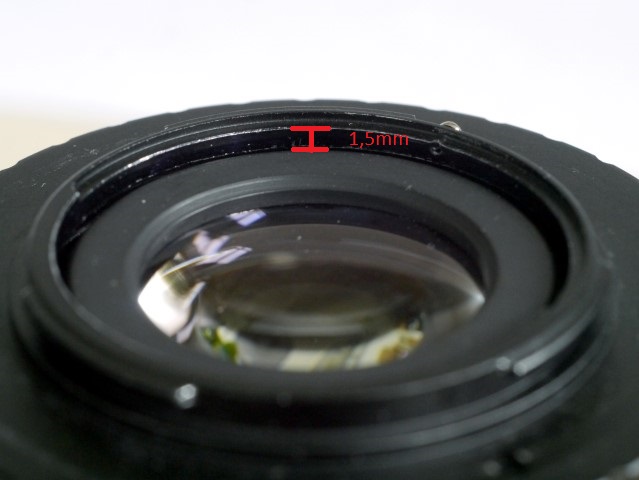 Damit steht die Sägekante auf der ersten Stufe des Helicoid auf wenn bis auf Anschlag eingeschraubt. Das hintere Ende des Objektivs ist dann noch ca. 1,5mm von der Aussparung der Kontaktstifte des C-Mount-M42 Adapters an die Kamera entfernt (Bild 3).