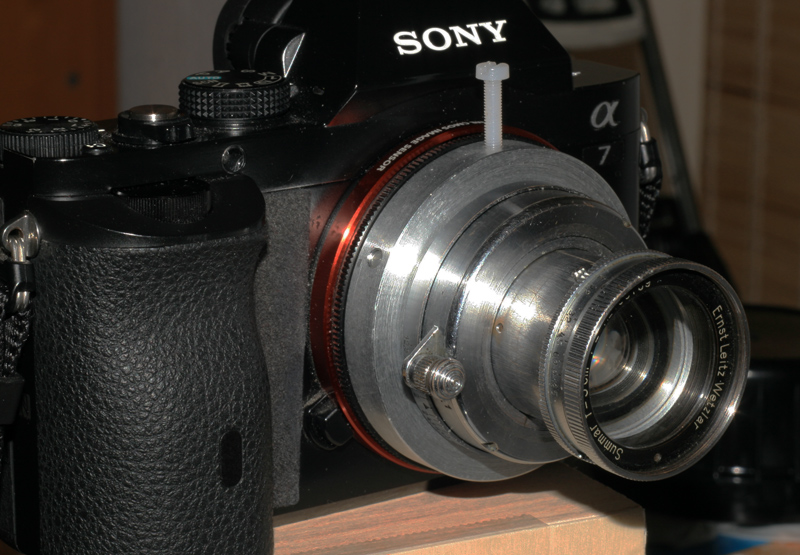 Länger konnte der Auszug adapterbedingt nicht mehr höher ausfallen, denn bei nur 28,8mm Auflagemaß des NEX LTM Adapters vor der Kamera ergeben sich so rechnerisch nur 28,8mm abzüglich dem Auflagemaß der Kamera von 18mm = 10,8mm für die maximale Länge eines Fokussiertubus bis zum Kamerabajonett und weitere 5 mm, welche der Fokustubus bis zur Begrenzung durch die Bauhöhe der elektronischen Kontakte in die Kamera eindringen darf, so dass die maximal mögliche Tubuslänge mechanisch auf 15,8mm begrenzt ist.