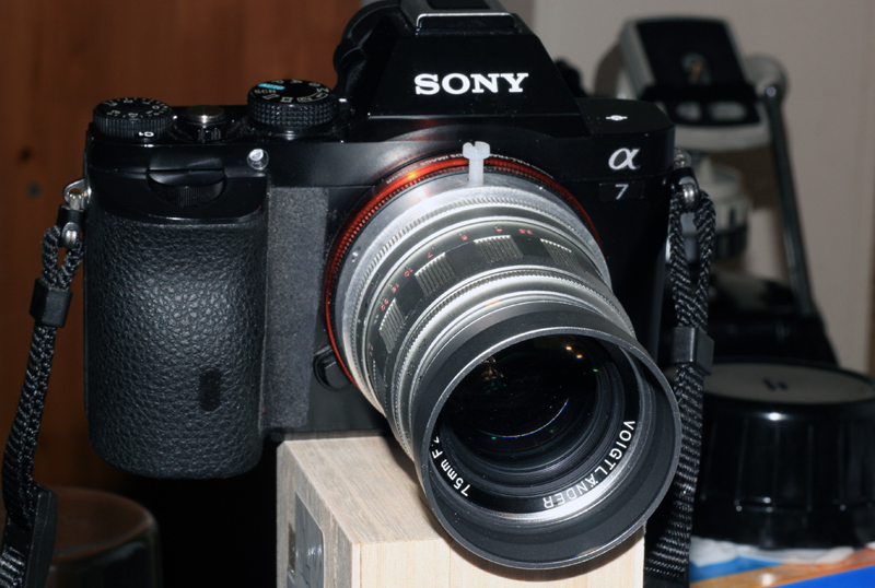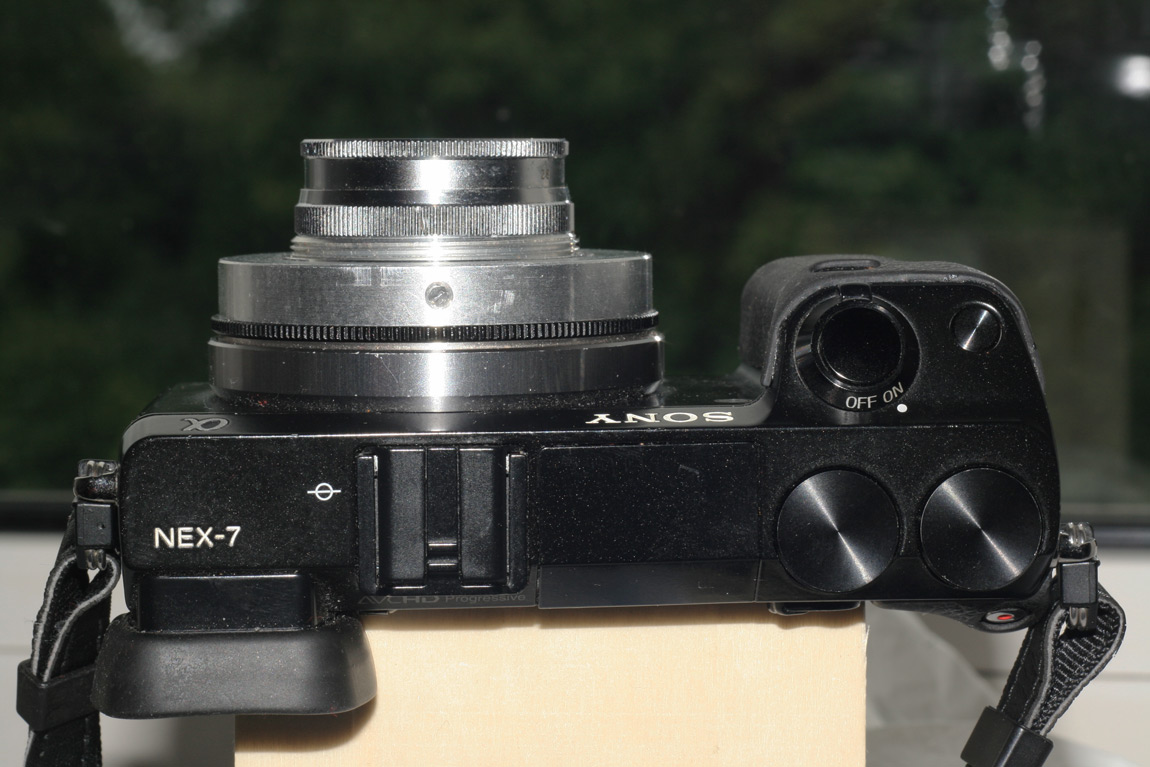 An die NEX7 wurde dann ein Lineal in der Höhe des „Sensorebenen – Symbols“ also Nullpunkt angelegt und der maximale Auszug des jeweiligen Systems eingestellt (weitester Auszug des Wendel). Mit einem vor dem Objektiv an die Kamera heran geschobenen Gegenstand wurde im Kamera LCD Monitor das Aufleuchten des Fokuspeaking beobachtet und am Lineal dann die Distanz des Gegenstandes von der Sensorebene abgelesen.
