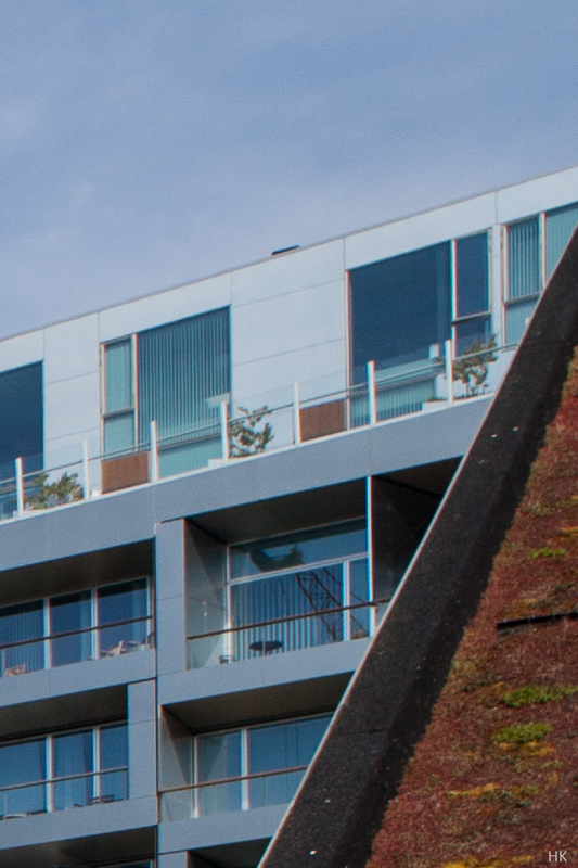 Die VIgnettierung ist bei f/8 verschwunden, die Verzeichnung nicht übermäßig ausgeprägt (minimal stärker als z.B. beim Nikkor Ai-S 2.8/20) aber leider komplex wellenförmig und daher nur schwer nachträglich zu korrigieren. Zum Glück sieht das bei solchen Testfotos meistens schlimmer aus als in der Realität und in der Praxis lässt sich auch Architektur recht ordentlich ablichten mit dem Rolleinar, solange nicht gerade Linien genau parallel in der Nähe des Bildrandes verlaufen.