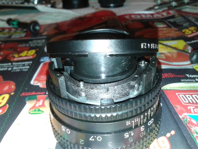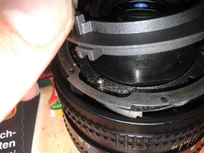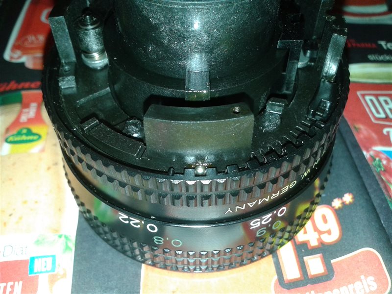Nun der Blendenring - Achtung, auf die Kugel achten !!! Position merken. Hier gleich der Hinweise, daß das "Einfädeln" der Kugel beim Zusammenbau Fingerspitzengefühl erfordert.