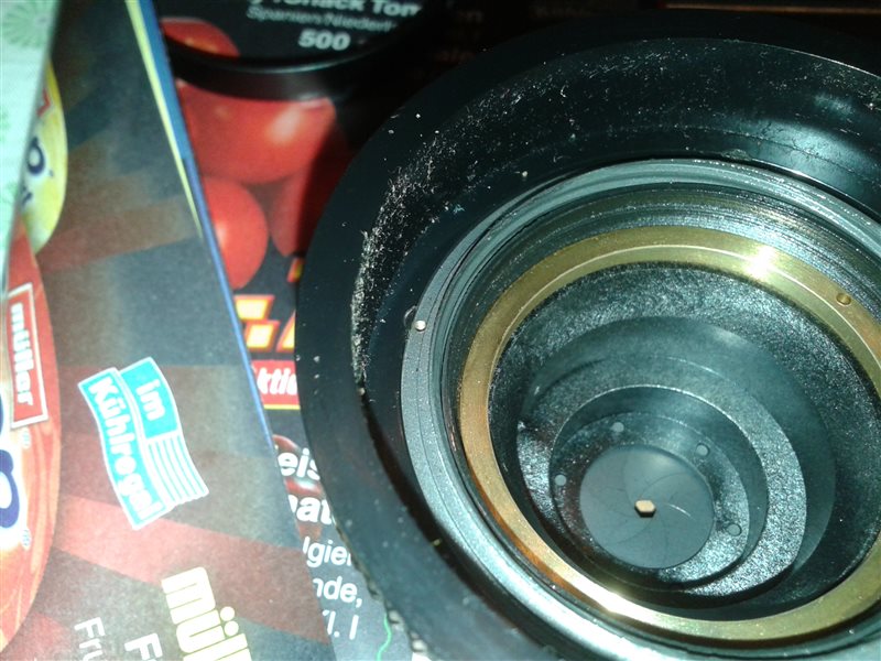 Für diejenigen, die die Blende reinigen wollen: Entweder man entfernt die vordere und hintere Linsen Gruppe und spült die Blende im eingebauten Zustand. Wie man die Blende demontiert, kann ich leider nicht sagen, da ich diese nicht ausgebaut habe. Vermutlich muß dazu der Messingring hinter der vorderen Linsengruppe herausgedreht werden, allerdings hat der nur eine (!) Bohrung. Die hintere Linsengruppe kann evtl. demontiert werden, bin mir wie gesagt nicht sicher.