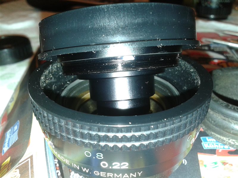 Zusammenbau umgekehrt. Wichtig: Der Messingspannring für den Metertrieb MUSS nach Montage mit Lack oder Sekundenkleber fixiert werden ! Dazu den Ring zuerst leicht handfest eindrehen. Testen, ob sich der Metertrieb noch gut verstellen läßt (Einstellring aus Kunststoff kurzzeitig draufschrauben). Der Messingring sollte eher etwas fester sitzen (damit leider auch etwas strammeres Fokussieren), damit möglichst wenig axiales Spiel besteht. Zu fest ist auch schlecht, denn es soll kein Fixfokus Objektiv sein :-)