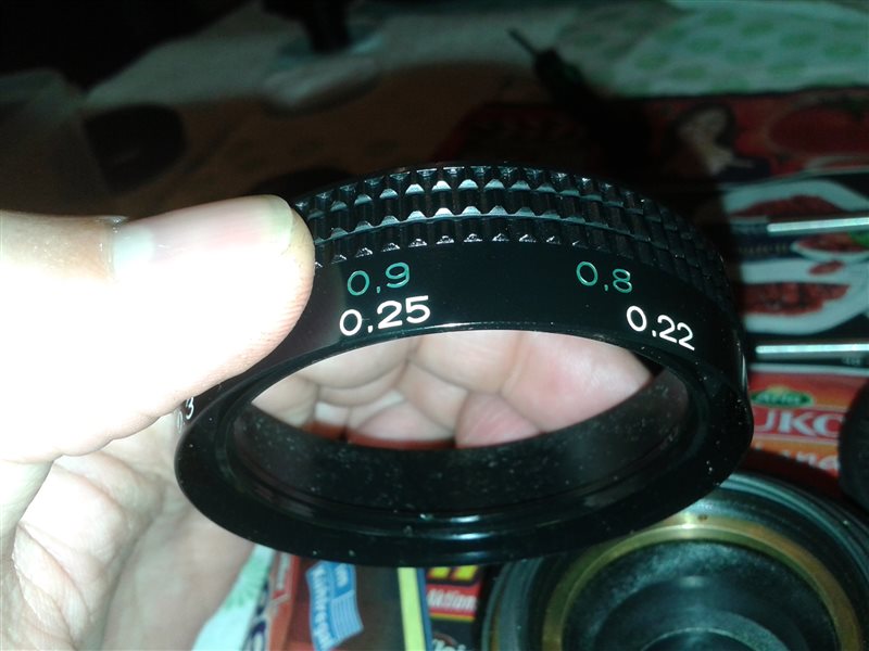 Dieser "Vorsprung" ist die Begrenzung für min. und unendlich Fokus. Der abgenommene Einstellring hat das entsprechende Gegenstück, welches die Bewegung begrenzt. (Es empfiehlt sich, den Einstellring bei unendlich oder min. Fokus auszubauen und sich die Position/Höhe des Metertriebs zu markieren - das erleichtert die Positionierung des Metertriebes beim Zusammenbau - insbesondere bei Totaldemontage.