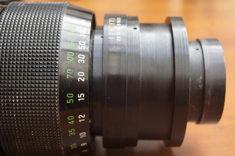 Der nächste Ring hat in Richtung des Blendenrings einen roten Punkt - wenn Blende 22 eingestellt sinds 2 Punkte. Die kleine Fixierschraube (nicht im Bild - sitzt in der Schräge) herausdrehen und den den Ring gegen den Uhrzeigersinn lösen - der saß bei meinem Exemplar ziemlich fest