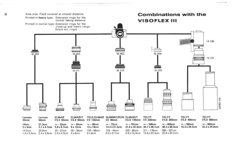 Wie man erkennen kann, sind es das Makro Elmar und insbesondere die langbrennweitigen Objektive, die das Visoflex System erschloss. Eine lange Zeit waren die Objektive mit Schraubgewindeanschlüssen ausgestattet, kamen dann aber mit dem späteren M-Bajonett auf den Markt.