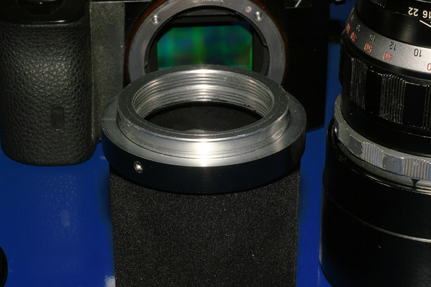 Schraubt man den hinteren Linsenträger eines solchen Meopta heraus - und nun kommt es - kann in das vorhandene Gewinde EXAKT ein Umkehrring 49mm auf Sony NEX eingeschraubt werden, wie im obigen Bild gezeigt...