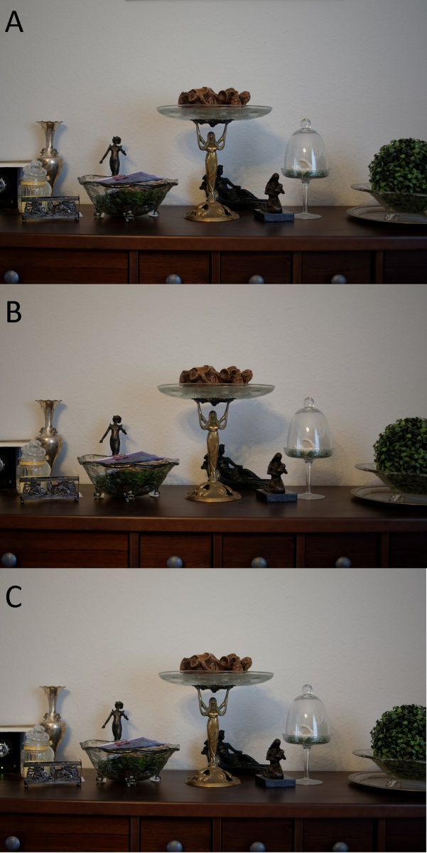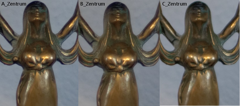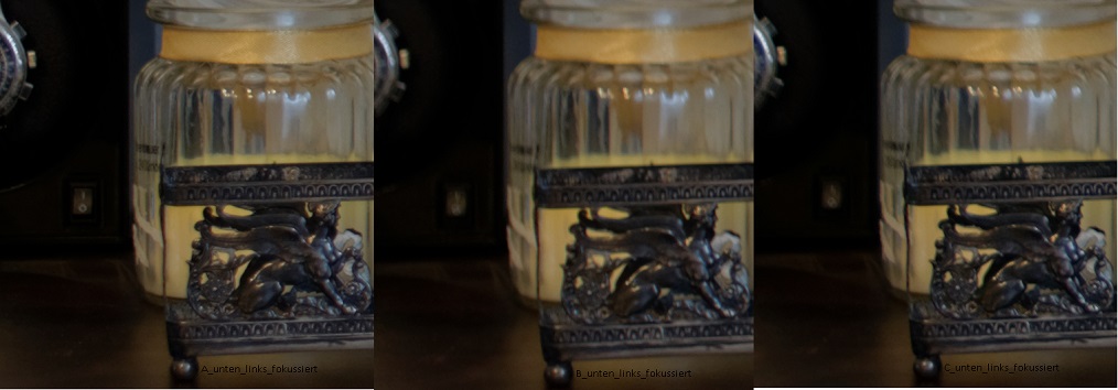 Keine allzu großen Unterschiede zu erkennen, allerdings wirkt A vom Farbton der Wand etwas kühler als B und C. Weiterhin scheint B am schärfsten aufzulösen, gefolgt von A und C.