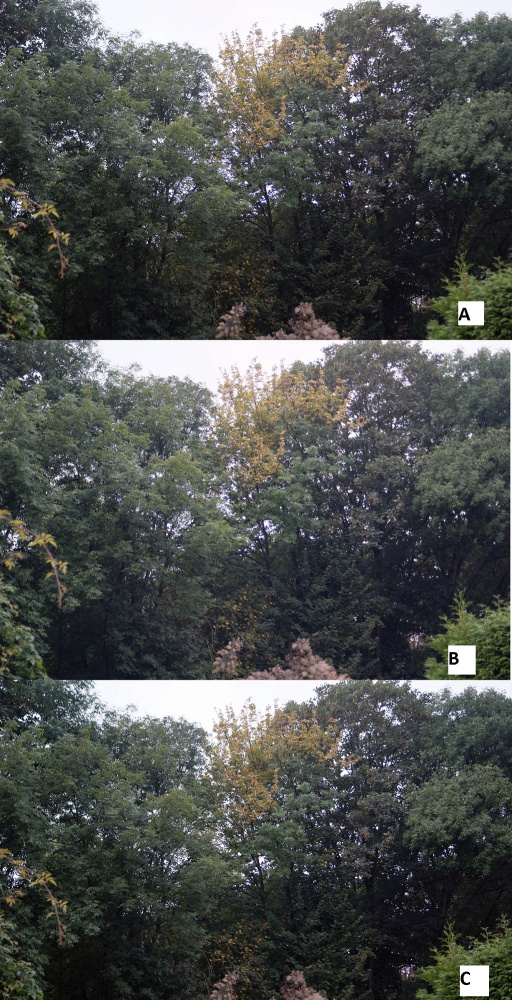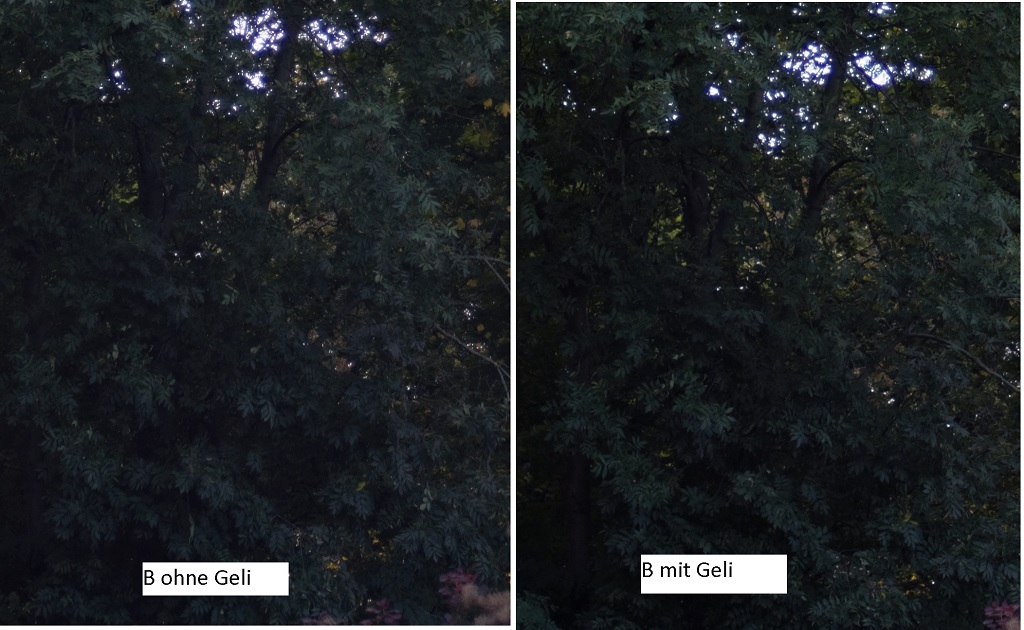 zum einen wollte ich nun doch mal testen, ob eine Geli den Kontrast von Objektiv B verbessert. Wieder nur die Bäume (ich geb's zu, die stehen gleich hinter'm Haus...) aber das Ergebnis spricht für sich: