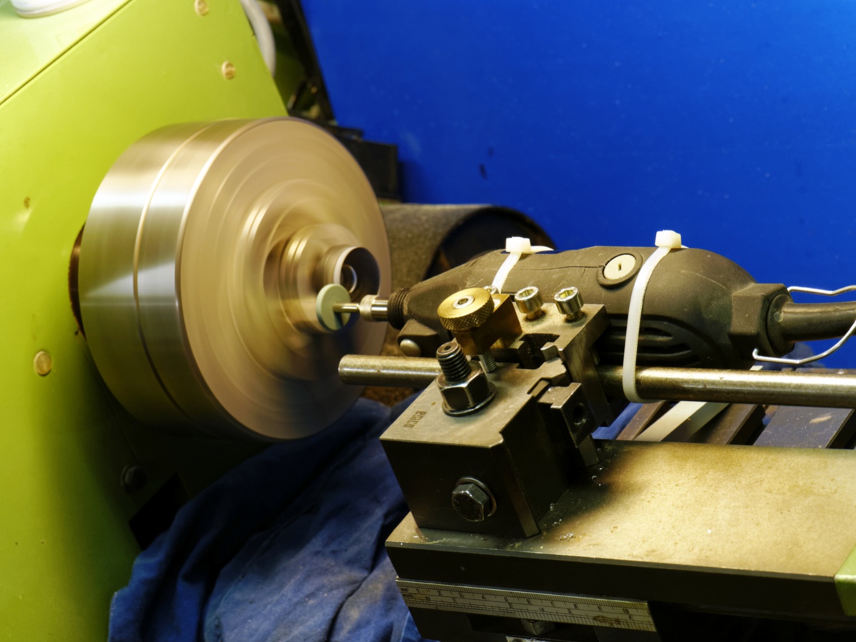 Ich habe einen Dremel-Schleifapparat am Support meiner Drehbank befestigt, das hintere Linsenelement ins Dreibackenfutter gespannt und losgeschliffen.