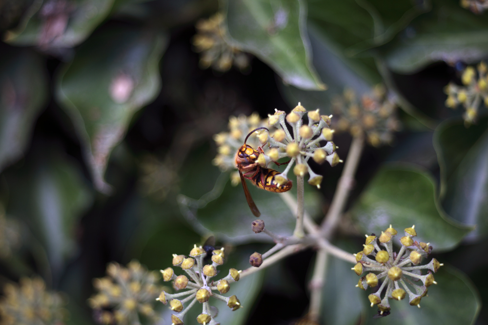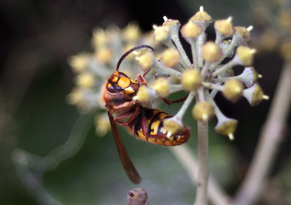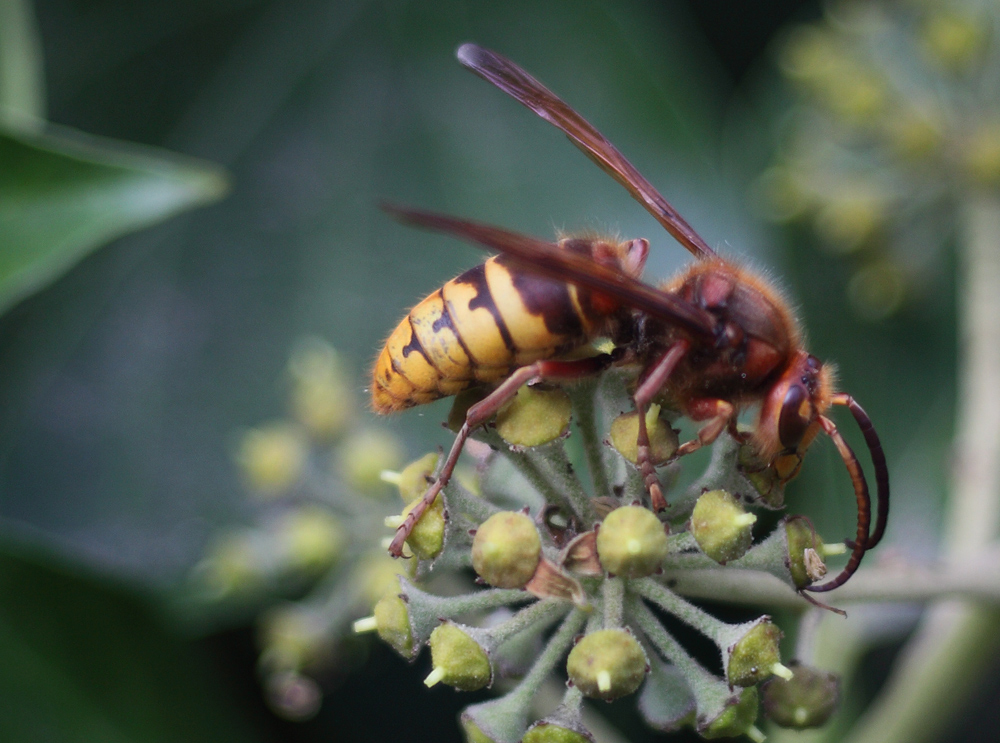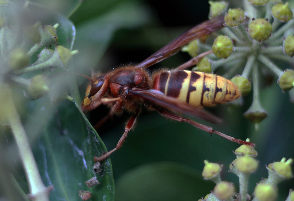 an einer Hauswand vorbei. Dort tummelten sich unendlich viele Wespen an einer Rankpflanze... und unter ihnen auch eine Hornisse !