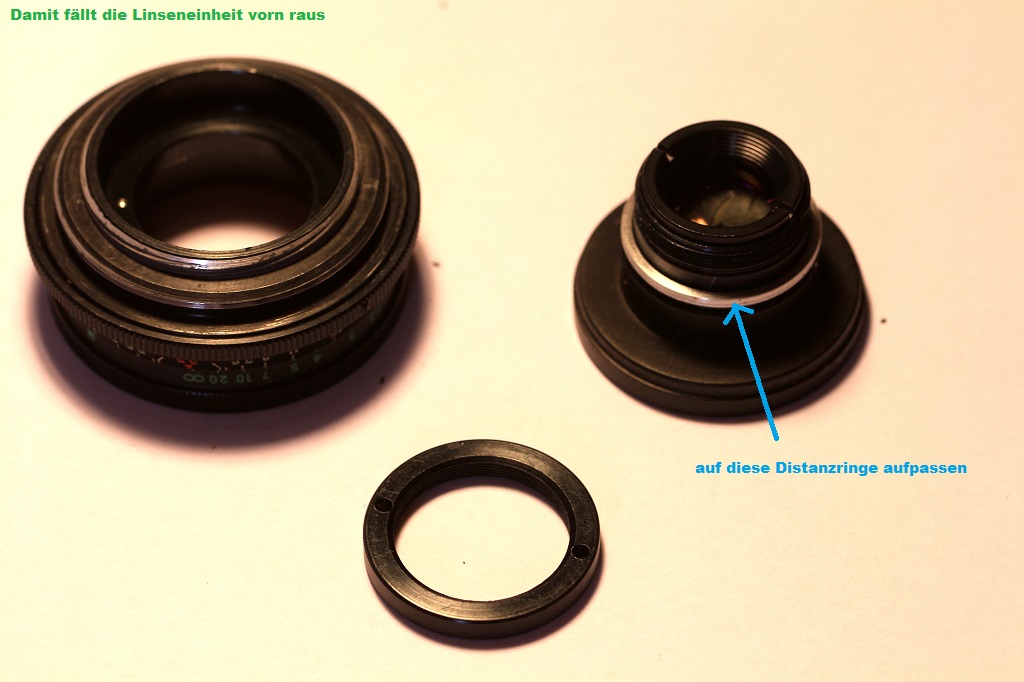 Da die Linsen sauber sind und die Blende "einigermaßen" funktioniert, wurde das Linsenelement nicht weiter zerlegt.