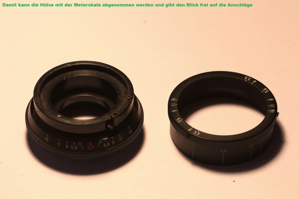 Hier ist bei den bedruckten Teilen wie Meterskala, Blendenskala und Tiefenschärfeskala etwas Vorsicht angebracht.