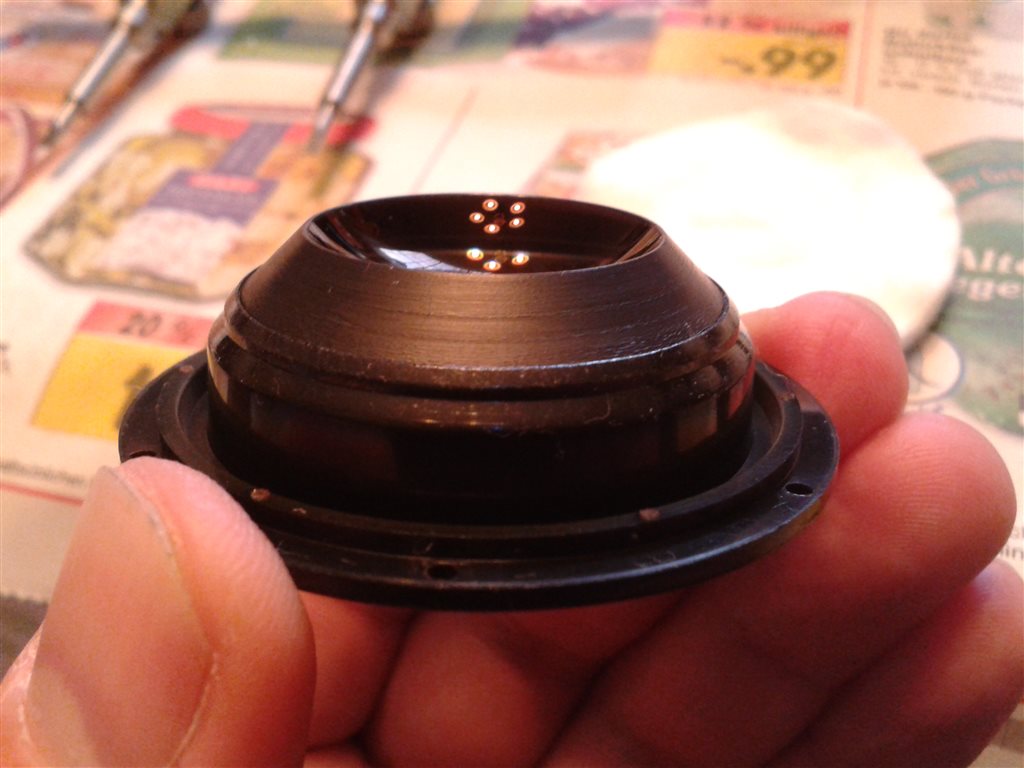 Um den Schneckengang zu reinigen muß das Objektiv von hinten geöffnet werden, was rel. einfach ist. Zuerst die äußeren 4 Schrauben lösen. Dann die gesamte Einheit abnehmen.