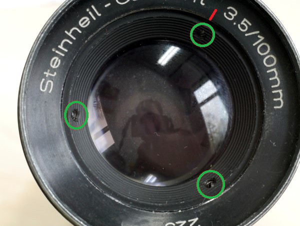 Um an den Fokus zu kommen zunächst die Einbaulage des Fokusrings gegen das Teil mit den drei Madenschrauben (Bild 3, rot) markieren. Bzw. bei mir sitzt eine Madenschraube genau in der Mitte der Lücke zw. "Cassarit" und "3.5". Sonst muss der unendlich-Fokus später mit der Hand bestimmt werden. Dann die drei Madenschrauben (Bild 3, grün) lockern. Damit kann der Fokusring abgenommen werden. Zwengs späterem Einbau: Die Linsengruppe kann jetzt bei mir um weitere 2cm eingeschraubt werden bis ich endgültig am Anschlag bin. Beim Ausschrauben Einrastposition markieren.