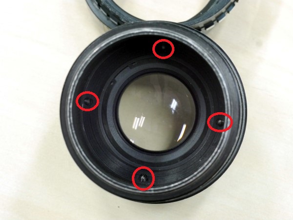 Dann von vorne ebenfalls die vier Madenschrauben lockern (Bild 6, rot). Damit kann der Ring mit der Schärfentiefeskala abgezogen werden. Vorsicht - darunter liegt die Rastkugel von der Blendenvorwahl. Dann kann auch der Ring von der Vorwahlblende abgenommen werden.