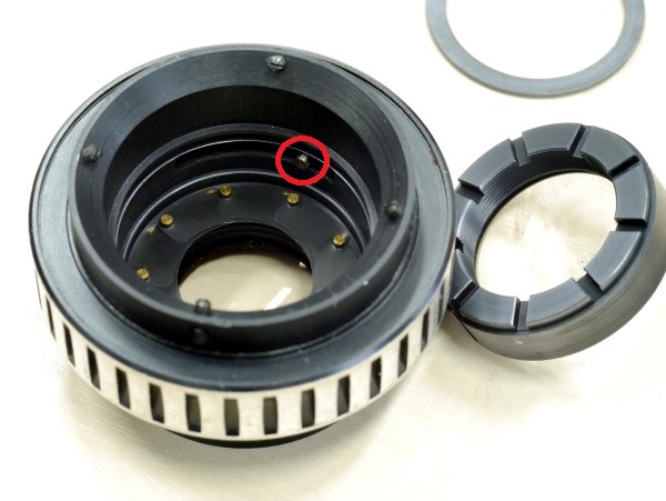 Um dann freier arbeiten zu können erstmal von hinten die Lage der Hülse mit dem M42 Gewinde gegen den Blendenring bei bekannter Stellung markieren sonst ist das Objektiv nachher verdreht an der Kamera. Das kann nachträglich aber auch einfach justiert werden. Dann die vier innenliegenden Madenschrauben lockern (Bild 5, rot) und die Hülse mit dem M42 Anschluß nach hinten abziehen.